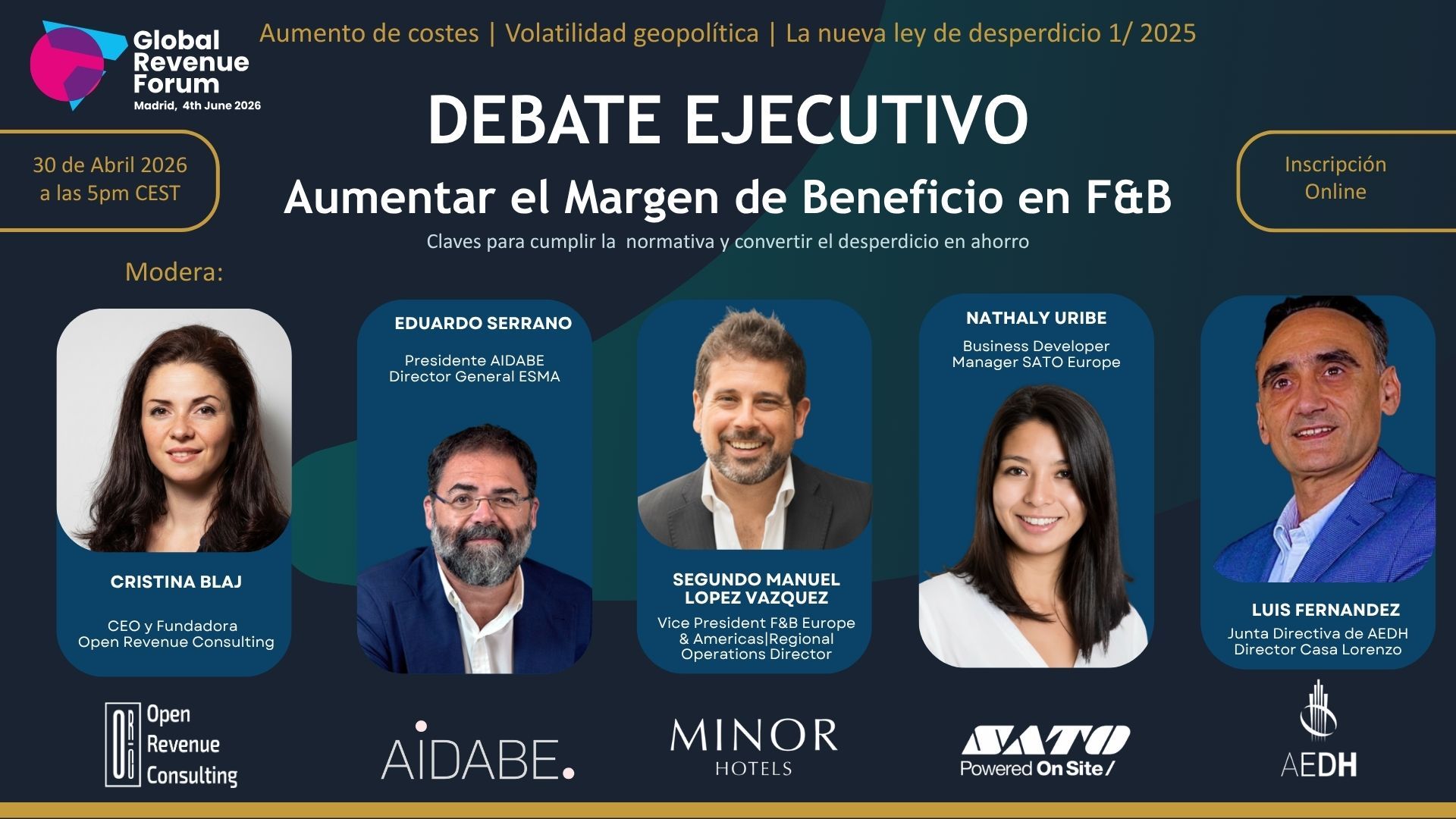 Este debate es un anticipo a nuestra próxima edición del Global Revenue Forum Madrid de 4 de junio de 2026 que se celebrará en el Espacio Maldonado de Madrid, un evento Desperdicio Cero que cuenta con un Think Tank que promete co-crear un modelo de rentabilidad para convertir el F&B de un centro de costes a una fuente adicional de ingresos y rentabilidad sostenible.