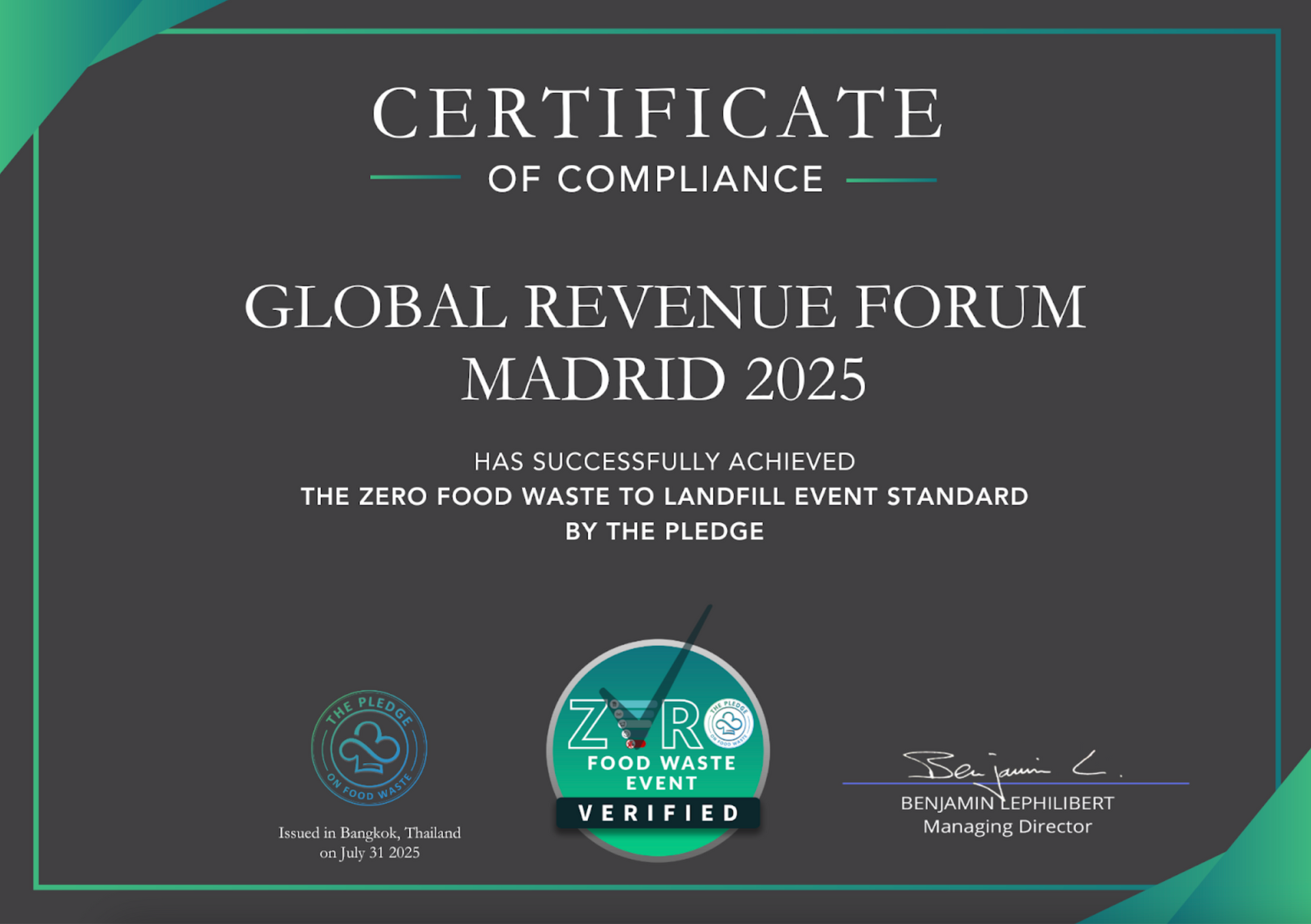 Además de conseguir resultados medibles a gran escala, también ha sido reconocida por celebrar el primer evento “Zero Food Waste to Landfill” en Europa durante el Global Revenue Forum Madrid 2025, marcando un hito en sostenibilidad aplicada a la industria del turismo y los eventos.