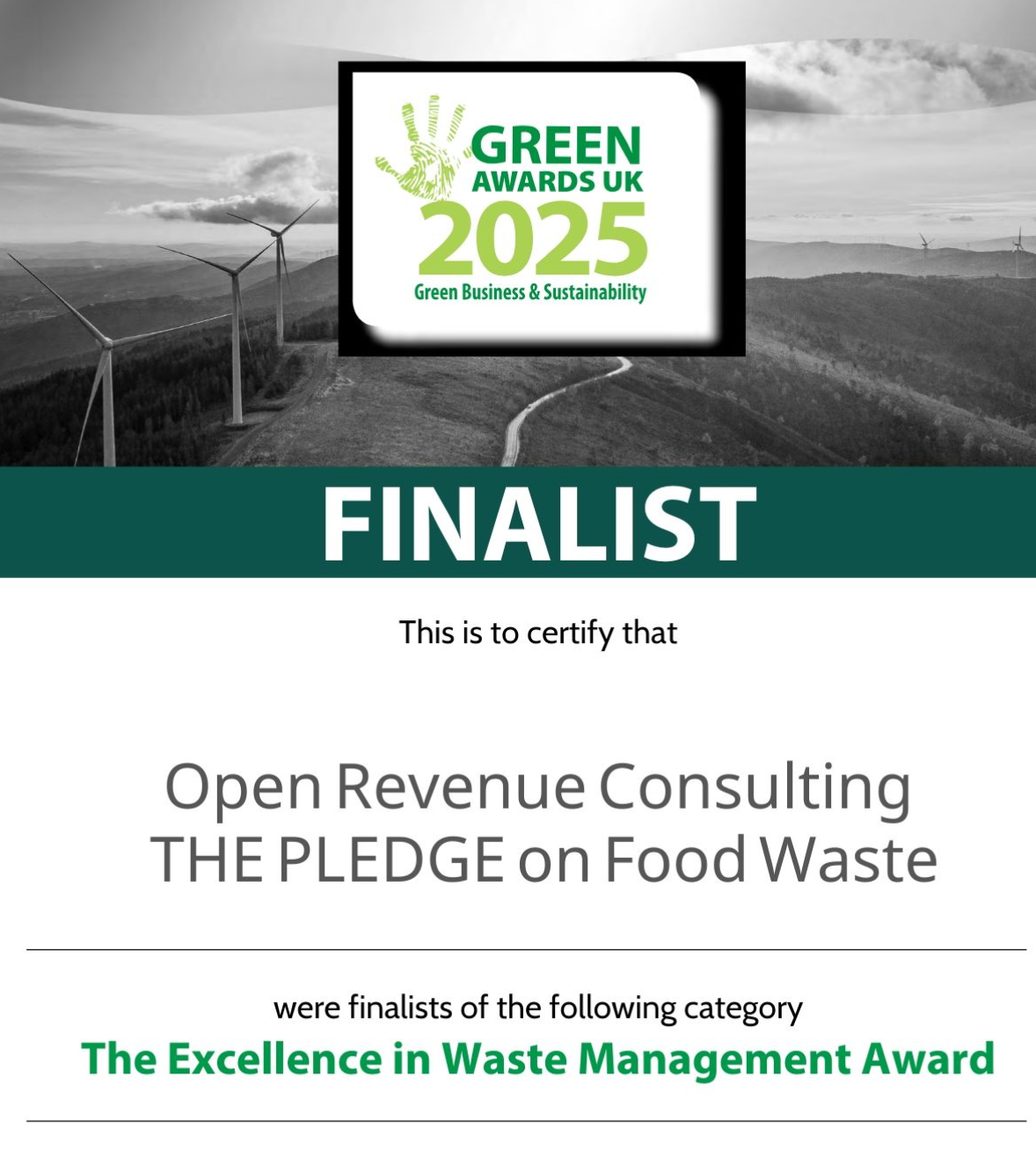 Open Revenue Consulting, finalista de los GREEN UK AWARDS de Turismo Sostenible gracias a su programa "The PLEDGE on Food Waste" para reducir el desperdicio alimentario y su objetivo de conseguir el Primer Evento Zero Waste de Europa