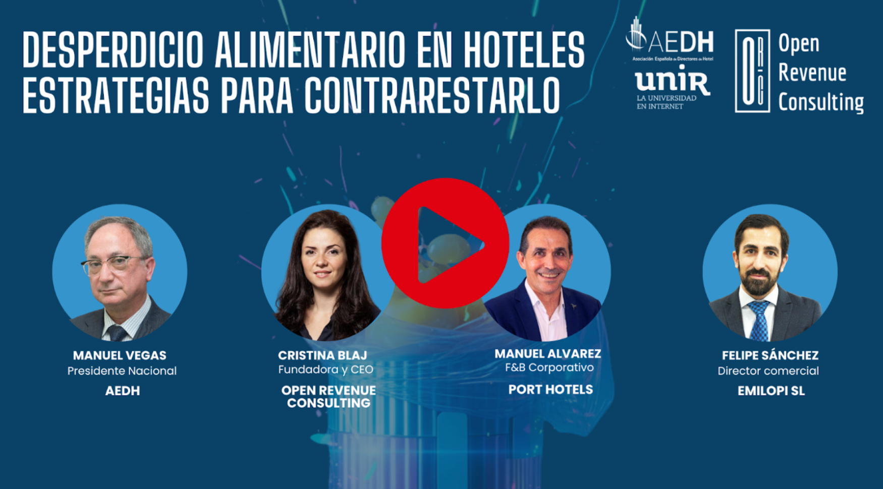 Con el objetivo de compartir experiencias, estrategias y casos de éxito en como reducir el desperdicio alimentario - Open Revenue Consulting de la mano de AEDH (Asociación Española de Directores y Directivos de Hotel y Restauración) y la Universidad Internacional de La Rioja (UNIR) celebró una Open Class para empresas y programas MBA, centrada en el tema del desperdicio alimentario en hoteles.