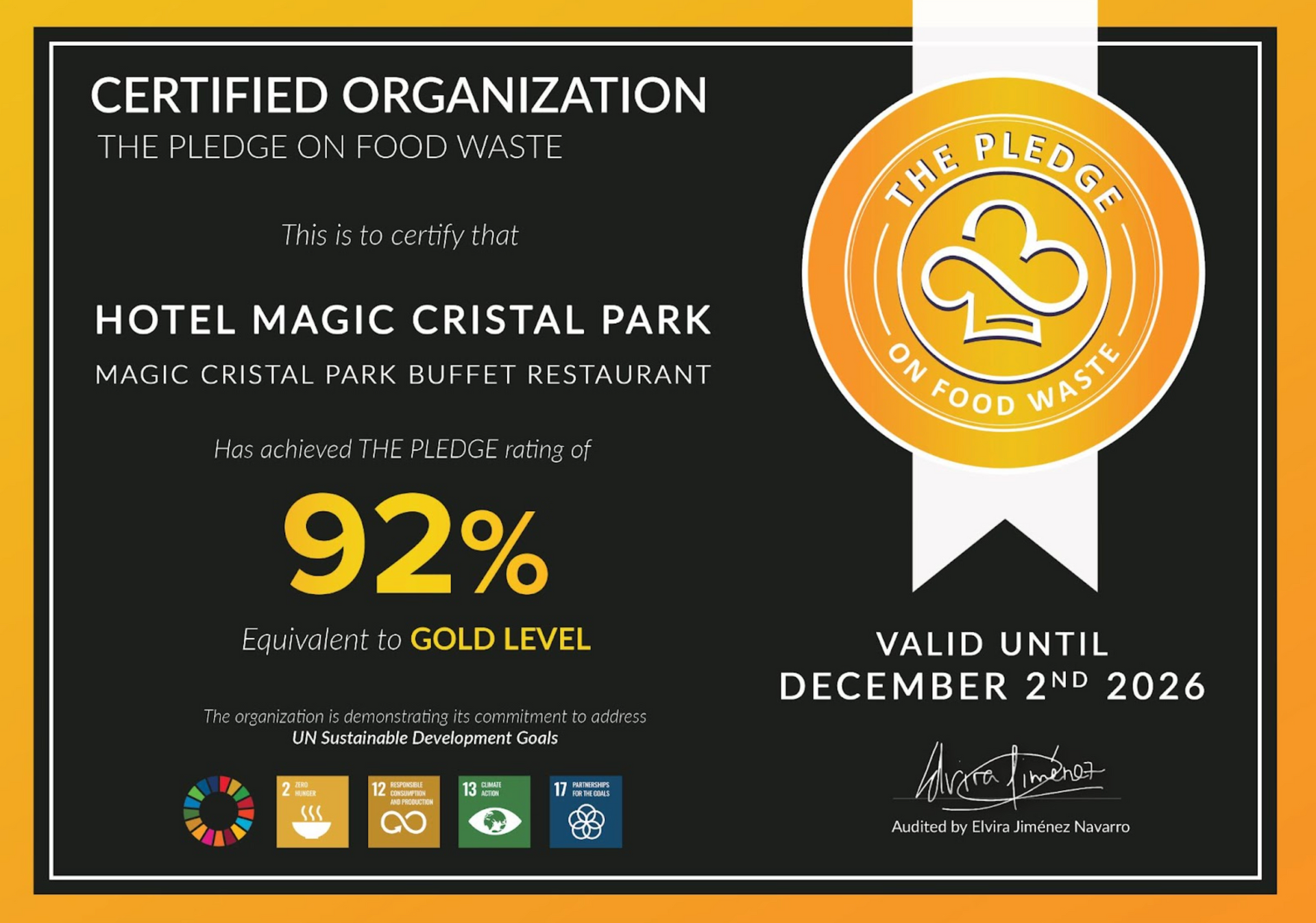 Certificación internacional: Obtención del sello The PLEDGE on Food Waste nivel GOLD, convirtiendo al hotel en el primer establecimiento certificado en España bajo el estándar más especializado en la gestión F&B a nivel global .