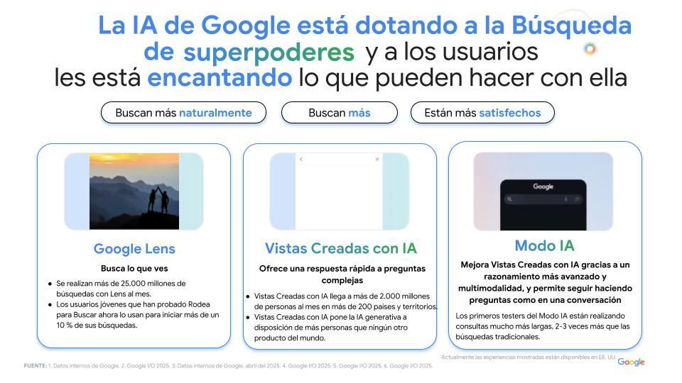 - Nuevos hábitos de búsqueda: los usuarios formulan preguntas más largas (30-40 palabras), combinando texto, voz e imagen (Google Lens).